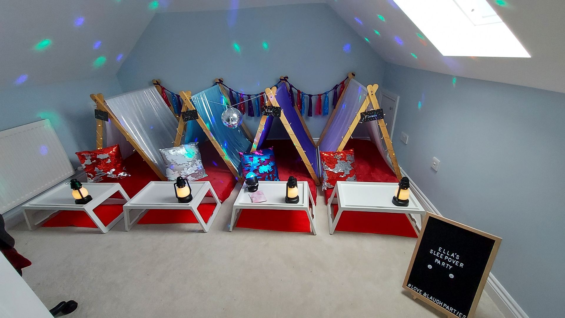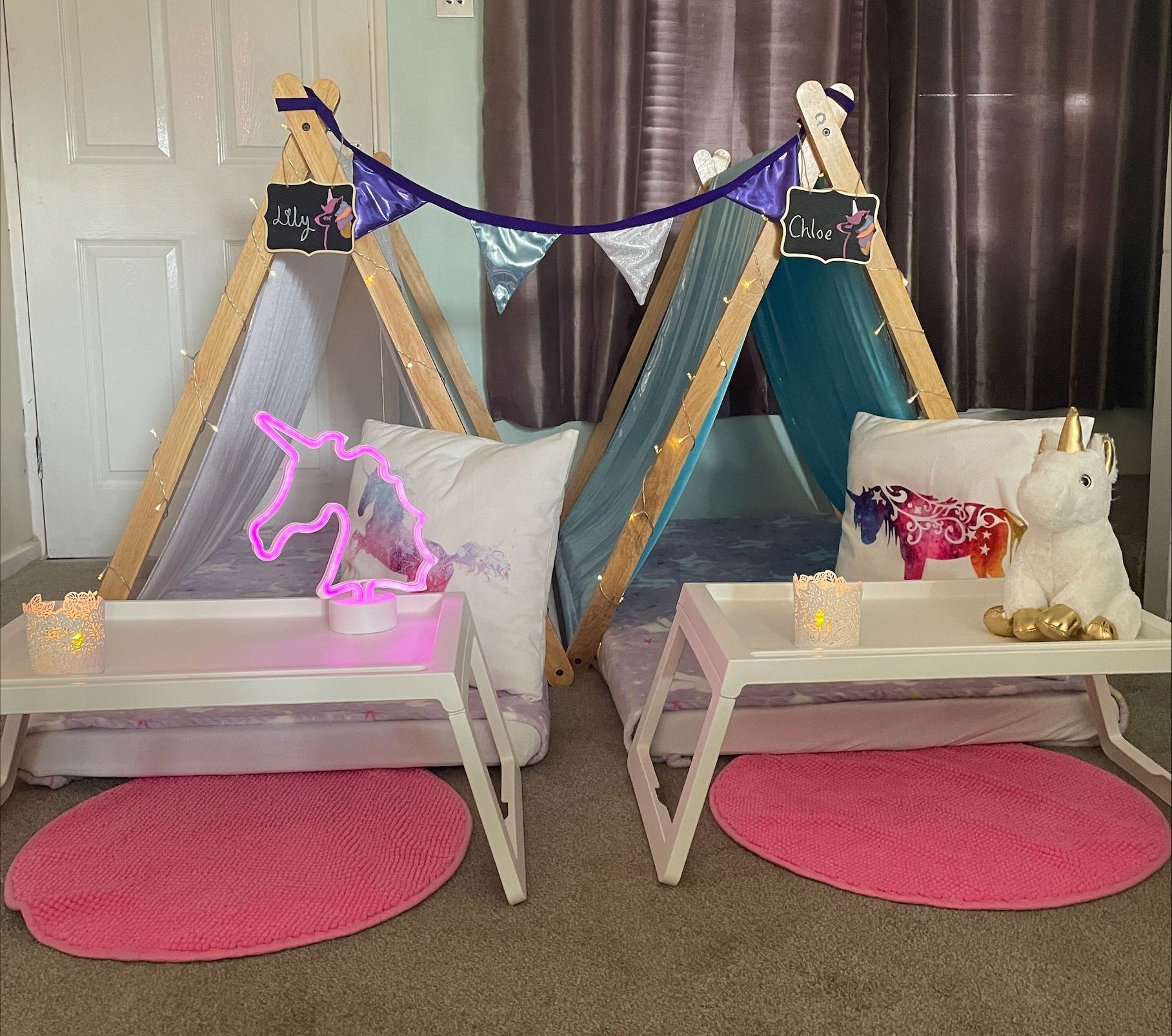 With Shimmering tent covers and bunting, cosy bedding, battery powered tea lights , breakfast trays, pink rugs, and a sprinkle of unicorn magic this is a perfect party for any unicorn lover.